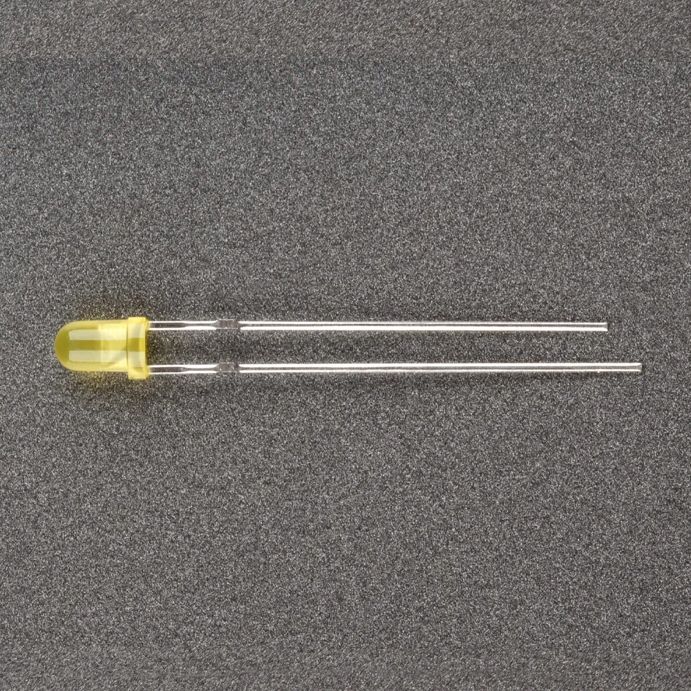 Поставка под заказ от 5000 шт. Выводной круглый светодиод, d=3 мм, диффузная желтая линза. Цвет свечения желтый (580-595 нм). Угол излучения 60°. Сила света Iv=100-150 мкд при If=20 мА. VF=1.9-2.3 В.