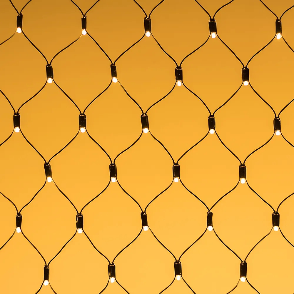 Светодиодная сеть Classic. 2500x2500 (длина 2500 мм, высота 2500 мм). Цвет свечения ТЕПЛЫЙ БЕЛЫЙ (3000 К). 432 светодиода размером 7 мм со статическим и 8 динамическими эффектами свечения с резким световым рисунком (прозрачная вогнутая линза). Провод черный, ПВХ. Питание 230 В, Мощность 26 Вт,защита IP65, применение в помещении и на улице под навесом Аксессуары для подключения и выбора режима свечения в комплекте.