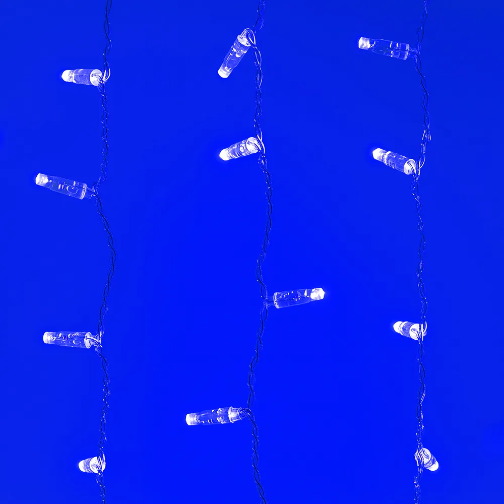 Светодиодный Занавес Classic. Размер 2000x3000 мм (длина 2000 мм, высота 3000 мм). 20 ниспадающих нитей длиной 3000 мм. 760 светодиодов размером 7 мм. Цвет свечения СИНИЙ, постоянное свечение и 8 динамических эффектов с резким световым рисунком (прозрачная вогнутая линза). Провод прозрачный, ПВХ. Питание 230 В, Мощность 60 Вт, защита IP65, применение в помещении и на улице под навесом. Аксессуар для подключения и выбора режима свечения в комплекте.