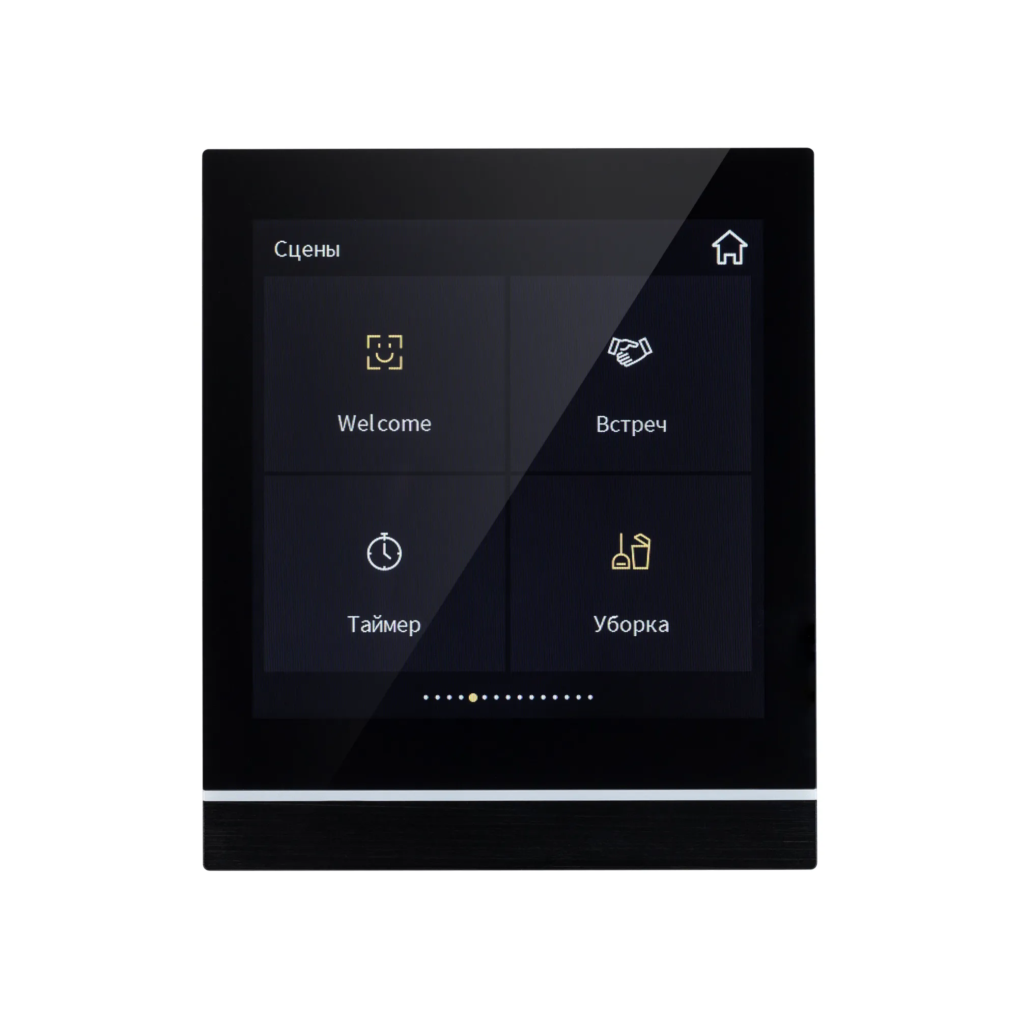 Многофункциональная встраиваемая настенная панель стандарта KNX с цветным сенсорным дисплеем 4.0”. До 16 слайдов, на каждом до 8 элементов управления. Виджеты для RGBW, MIX (CCT), климатики, мультимедиа. Встроенный датчик температуры. Логические функции. Разрешение экрана 480*480. Требуется дополнительное питание AUX DC 24-30V. Размер 86x101x32 мм.