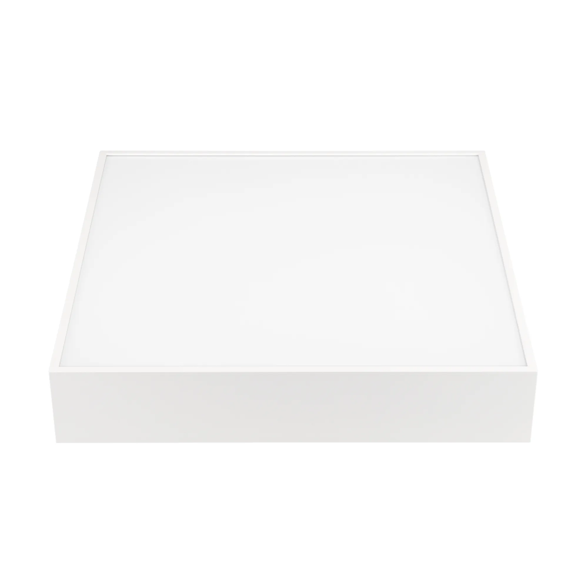 Накладной светильник. Мощность 30 Вт, св. поток 2000-2540 лм, 85 лм/Вт, теплый 3000 K, CRI>90, угол 120°, напряжение питания 230 В. Белый квадратный корпус из алюминия, экран PC, степень защиты IP40. Размер: длина 350 мм, ширина 350 мм, высота 64 мм. Монтаж накладной. Драйвер 27-42 В, 800 мА, пульсация <5%.
