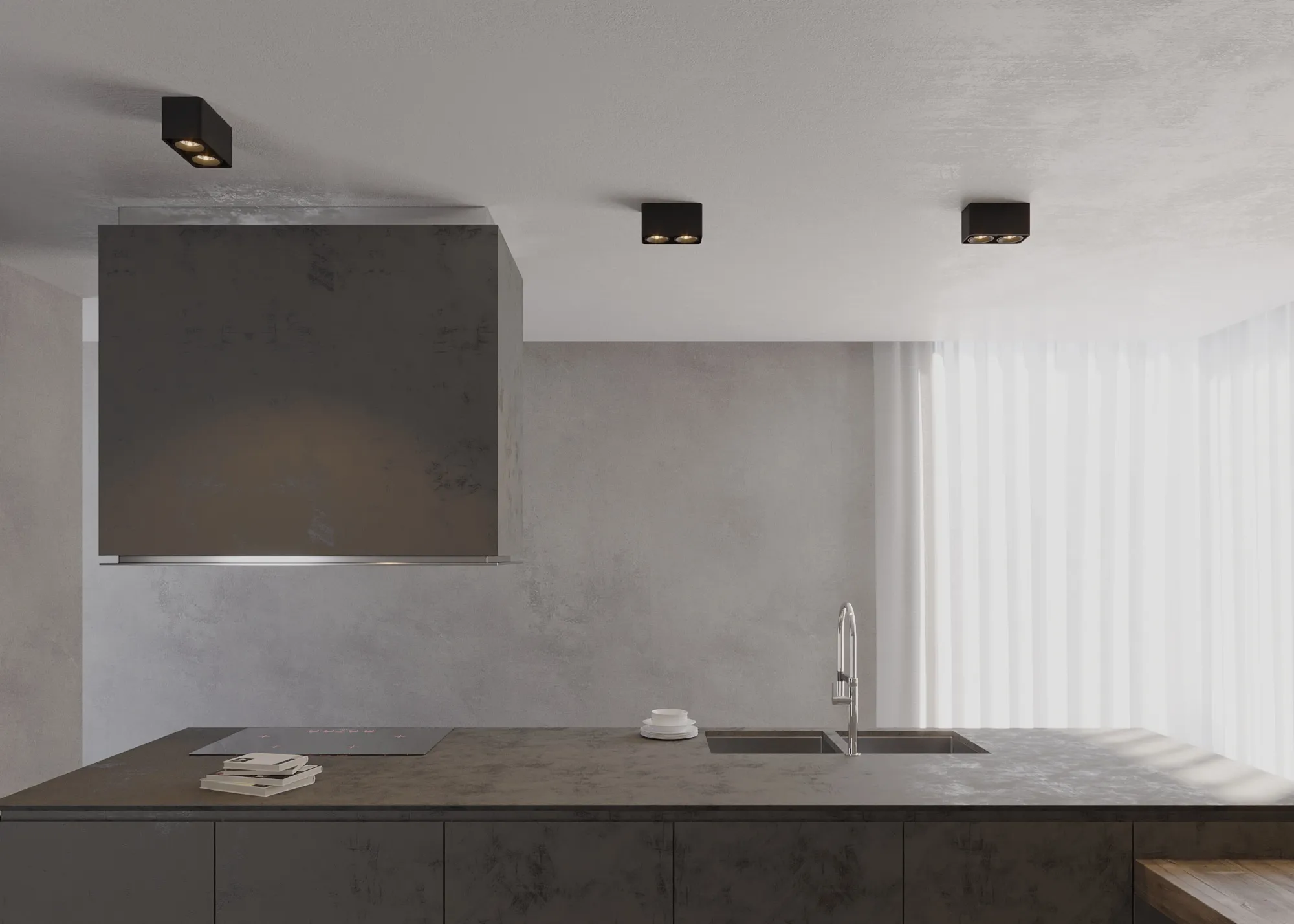 Накладной интерьерный светильник. Мощность 16 Вт, св. поток 1490 лм, 98 лм/Вт, теплый 3000 K, CRI>90, угол 45°, регулируемое направление луча 30°, напряжение питания 230 В. Черный квадратный корпус из алюминия, степень защиты IP20. Размер: длина 195 мм, ширина 100 мм, высота 100 мм. Монтаж накладной. Драйвер 26-40 В, 400 мА, пульсация <5%.