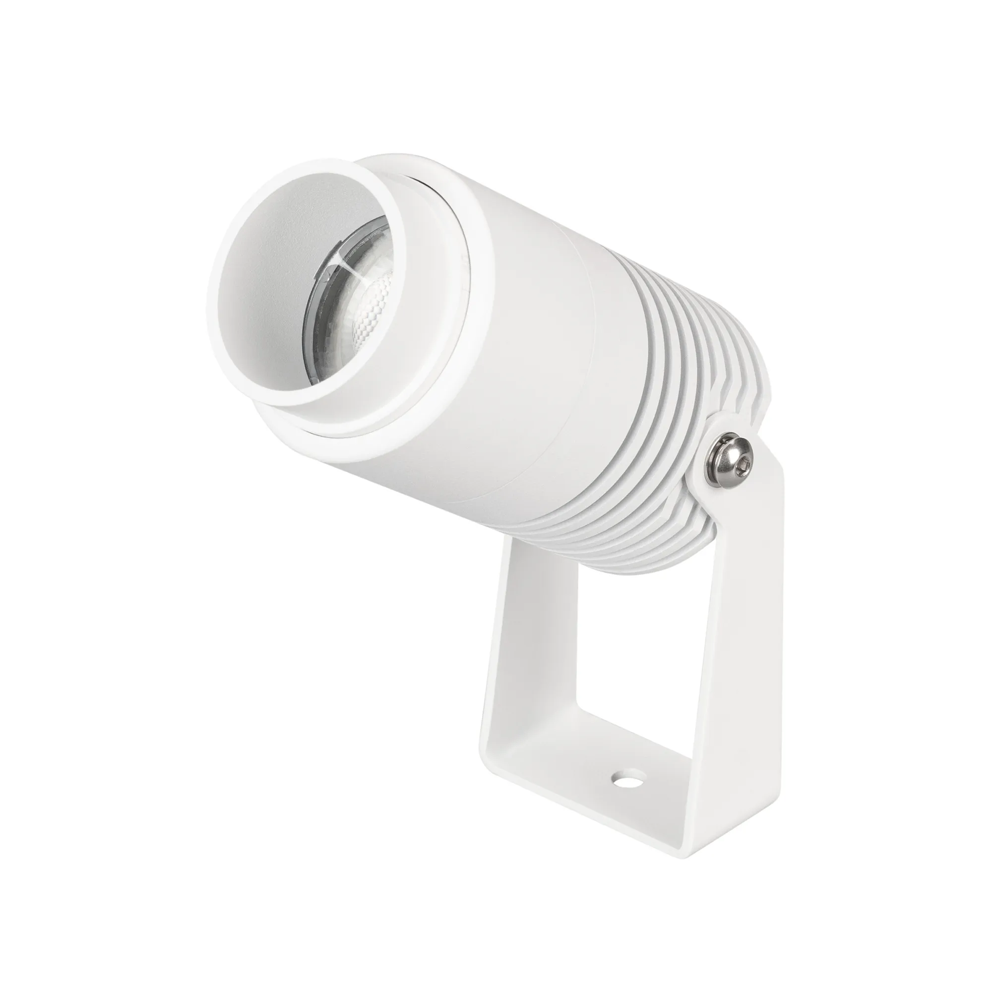 Уличный светодиодный прожектор, мощность 8Вт, регулируемый угол освещения 10-40°. Цвет ТЕПЛЫЙ 3000К, световой поток для угла 10° 240 для угла 40° 420лм. Влагозащищенный корпус IP67 - белый алюминий, экран из закаленного стекла. Угол поворота корпуса в вертикальной плоскости 135°. Питание 230В, мощность 8 Вт. Размеры DxH - Ø52x103мм. В комплекте 1м провод.