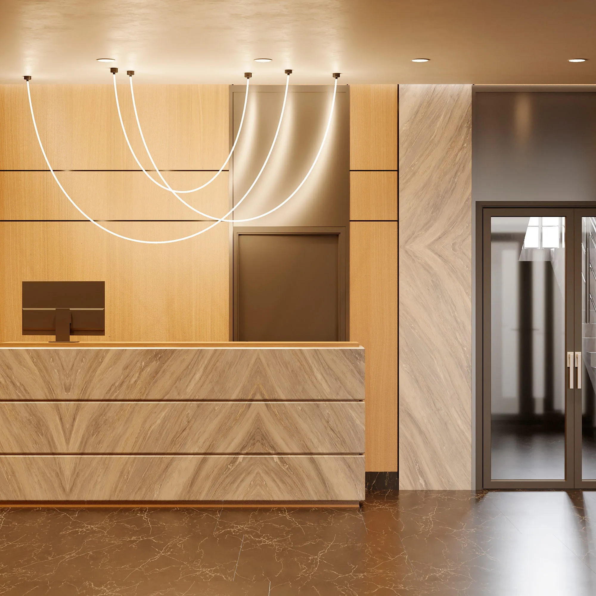 Подвесной светильник. Мощность 58 Вт, св. поток 3900 лм, 67 лм/Вт, дневной 4000 K, CRI>90, угол 360°, напряжение питания 230 В. Черный круглый корпус из стали, силиконовая герметичная лента, степень защиты IP20. Размер: диаметр утапливаемой части чаши 64 мм, высота чаши с утапливаемой частью без вывода под неон 40 мм, общая высота чаши 57 мм, диаметр чаши с фланцем 100 мм, диаметр силиконовой герметичной ленты 18 мм, длина силиконовой герметичной ленты 5000 мм. Монтаж встраиваемый, глубина установки 55 мм, диаметр установочного отверстия 70 мм. Блок питания 24 В, 2500 мА, пульсация <5% в комплекте.
