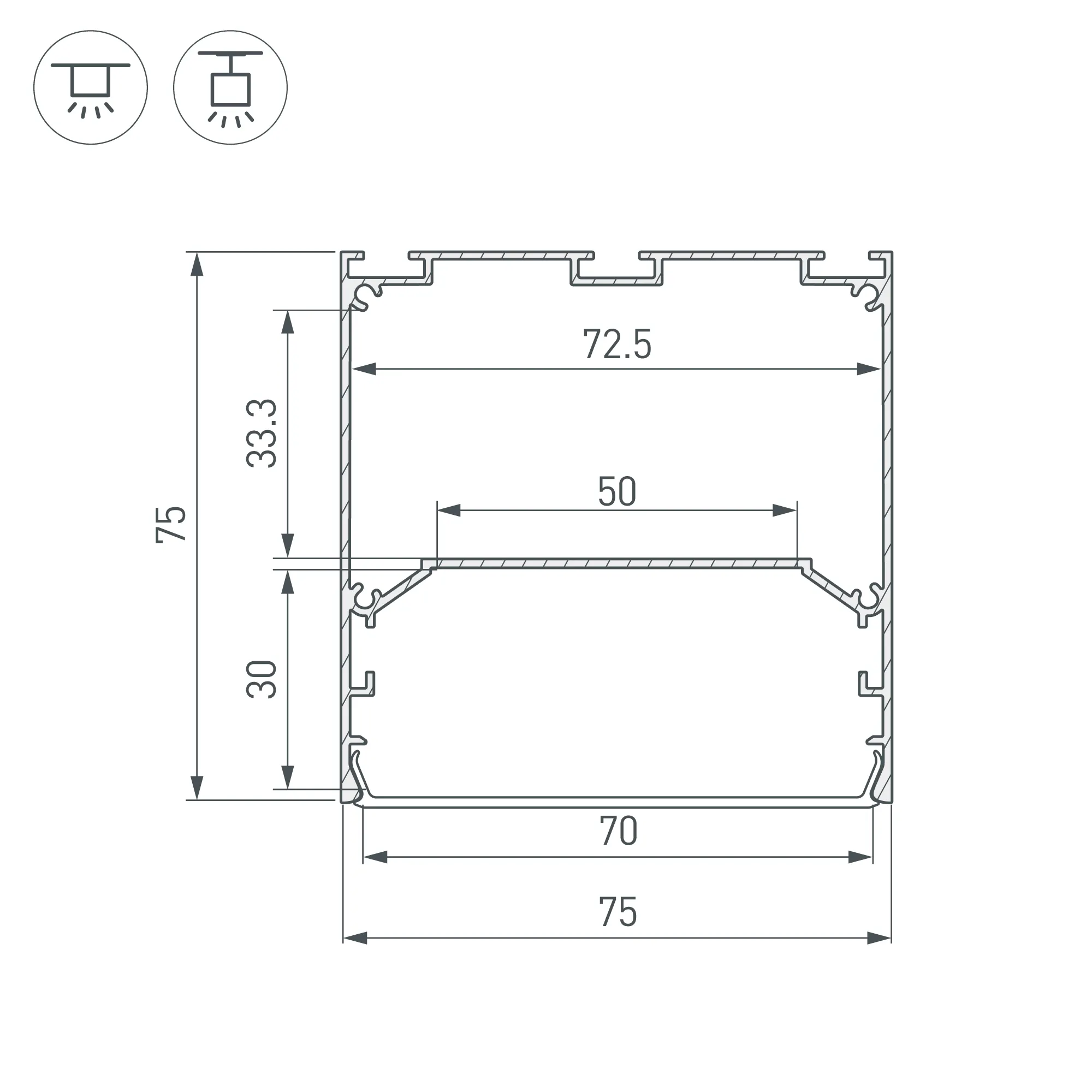 Алюминиевый профиль для светодиодных лент и линеек. Цвет - черный RAL9005 (порошковая окраска). Габаритные размеры (L×W×H): 3000x75x75 мм. Ширина площадки для ленты 50 мм. Отсек для БП 72,5х33,3 мм. Экраны, заглушки и другие аксессуары приобретаются отдельно. Цена за 1 метр.