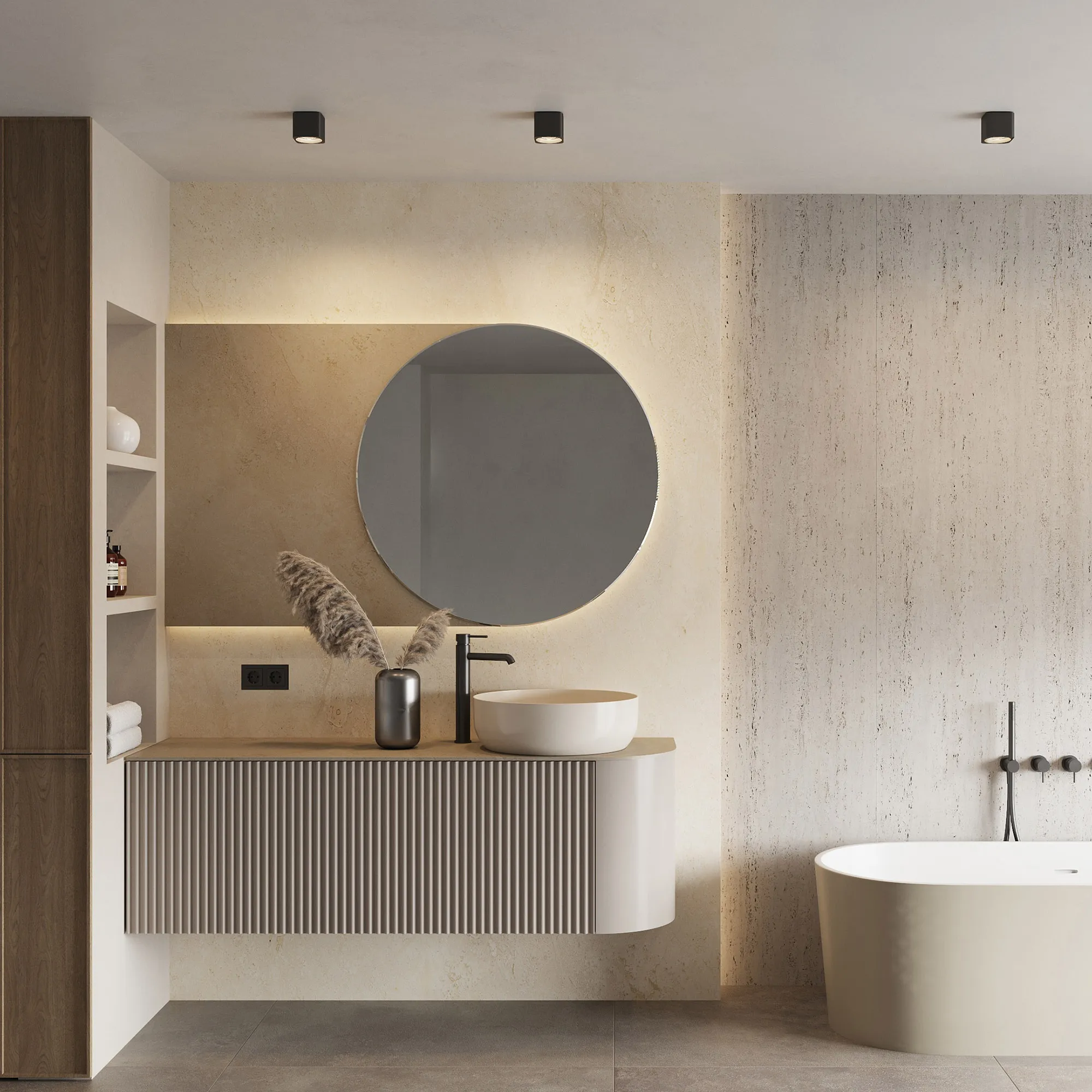 Накладной интерьерный светильник. Мощность 10 Вт, св. поток 780 лм, 78 лм/Вт, теплый 3000 K, CRI>90, угол 24°, напряжение питания 230 В. Черный круглый корпус, степень защиты IP54. Размер: диаметр 77 мм, высота 65 мм. Монтаж накладной. Драйвер встроенный, пульсация <5 %.