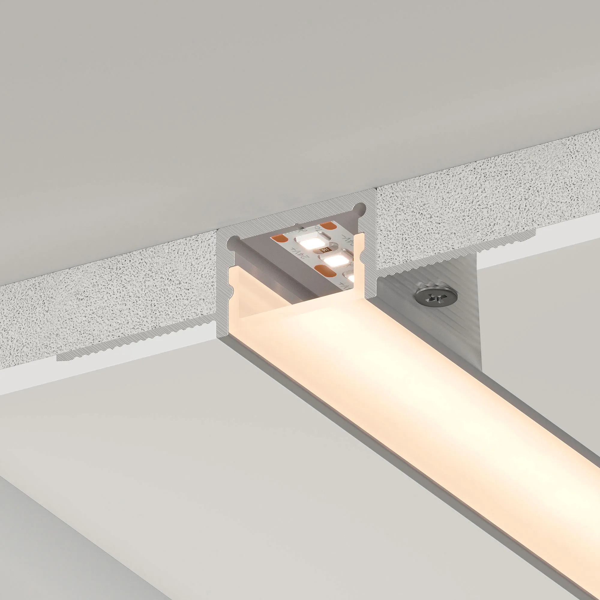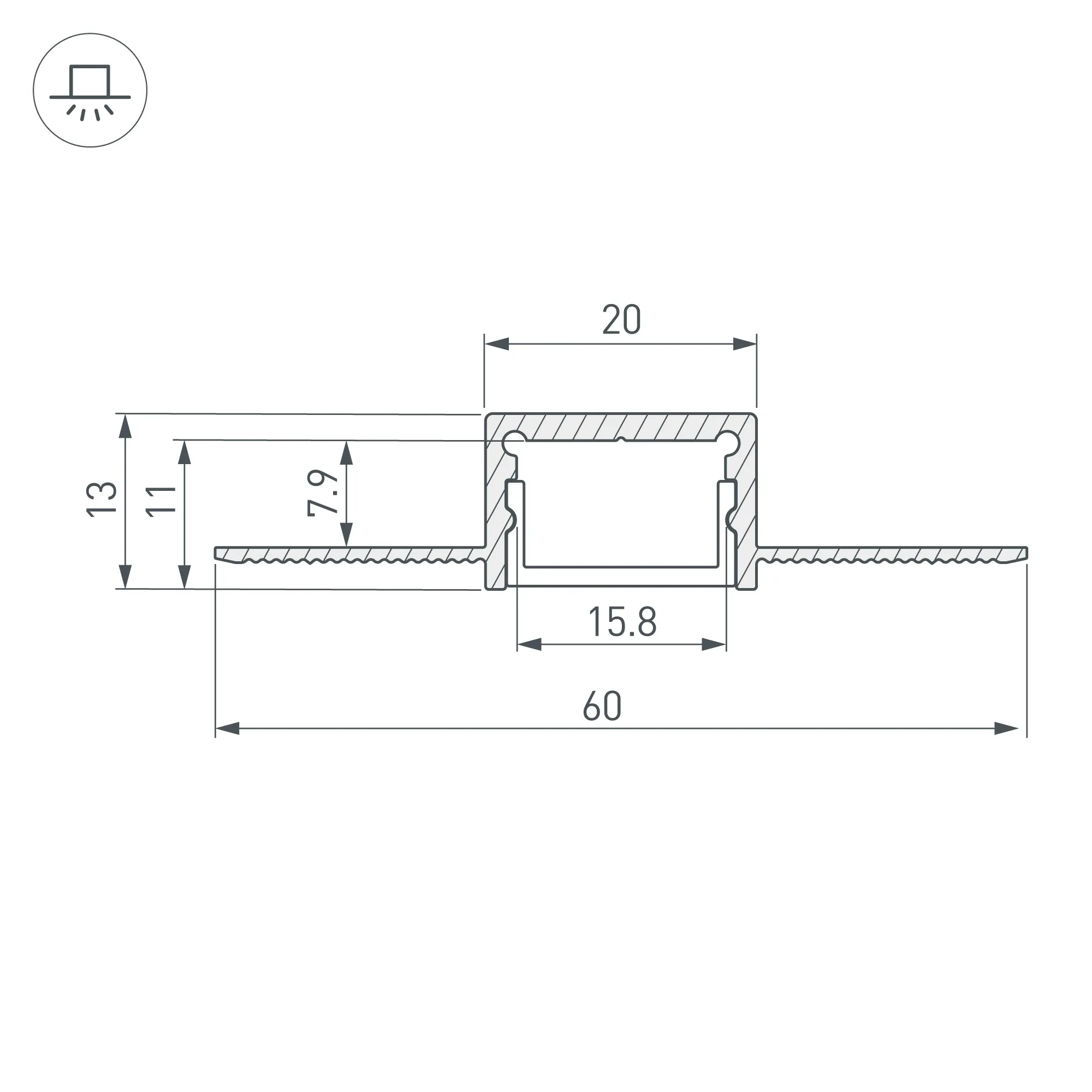 Алюминиевый анодированный профиль для светодиодных лент и линеек. Скрытая установка (под строительную отделку). Габаритные размеры (L×W×H): 2000x60x13 мм, паз для установки 20 мм. Ширина площадки для ленты 15,8 мм. Экраны, заглушки и другие аксессуары приобретаются отдельно. Цена за 1 метр.