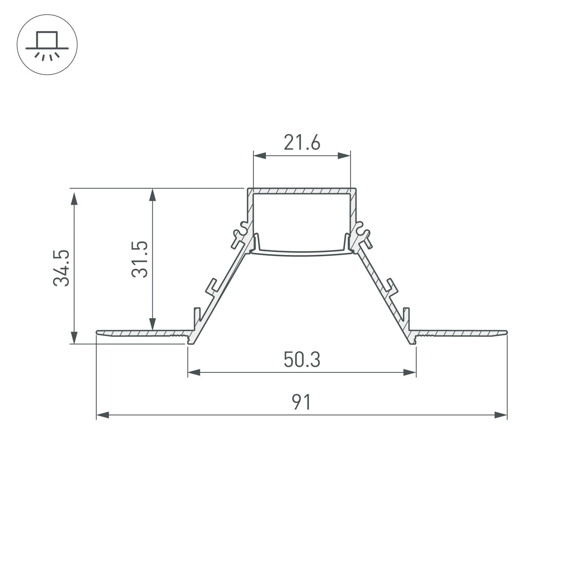Алюминиевый профиль для светодиодных лент и линеек. Скрытая установка (под строительную отделку). Цвет - белый RAL9016 (порошковая окраска). Экран утоплен в плоскости профиля, что позволяет скрыть источник света от прямого контакта с глазами. Габаритные размеры (L×W×H): 2000x91x34,5 мм. Ширина площадки для ленты 21,6 мм. Экраны, заглушки и другие аксессуары приобретаются отдельно. Цена за 1 метр.