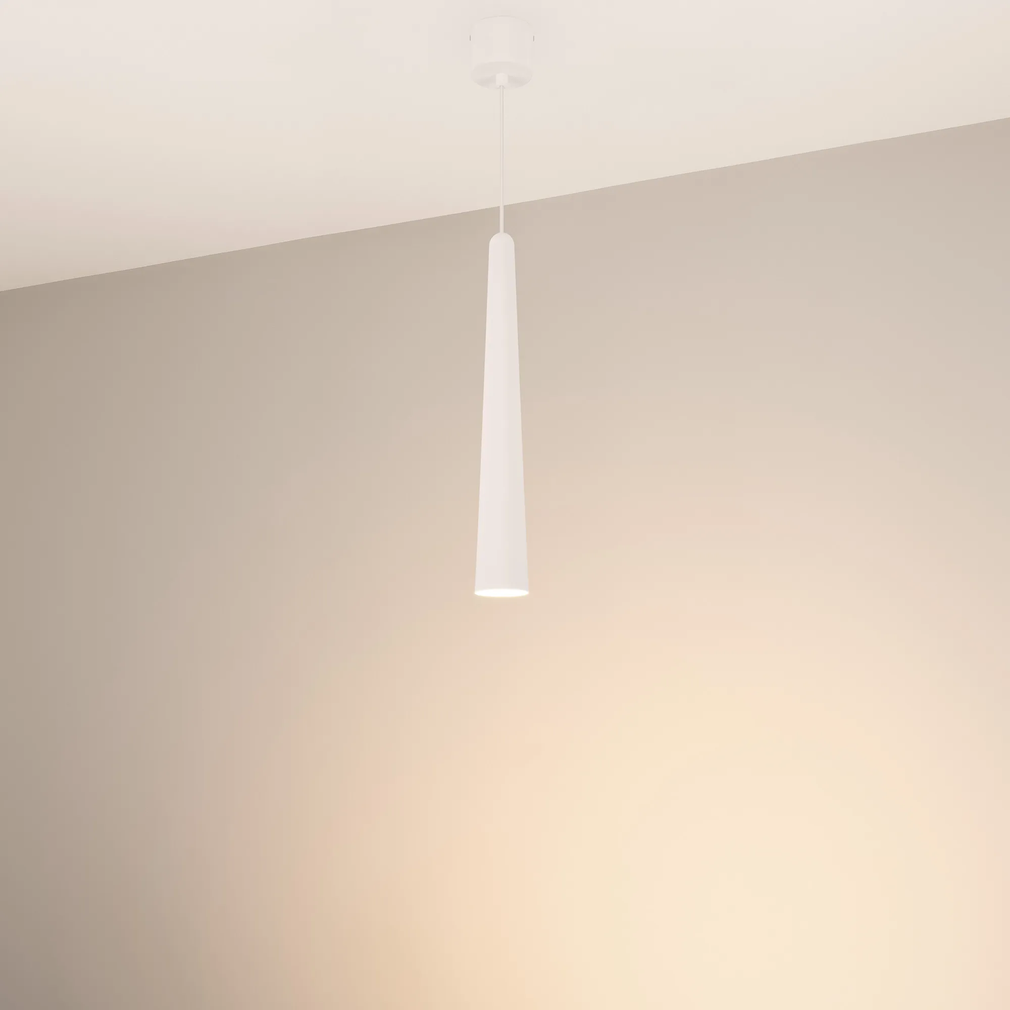 Подвесной светильник. Мощность 5 Вт, св. поток 400 лм, световая эффективность 70 лм/Вт, теплый 3000K, CRI>92, угол 36°, напряжение питания 230 В. Белый конусообразный вытянутый корпус из алюминия, линза из PMMA, степень защиты IP20. Размер: диаметр 57 мм, высота 400 мм. Монтаж подвесной, длина подвеса 2000 мм, регулируемая. В комплекте 2 вида чаш. Габариты встраиваемой чаши: Ø 80x41 мм. Габариты накладной чаши Ø80x60 мм. Драйвер 2,8-12В, 500 мА, пульсация <1%.