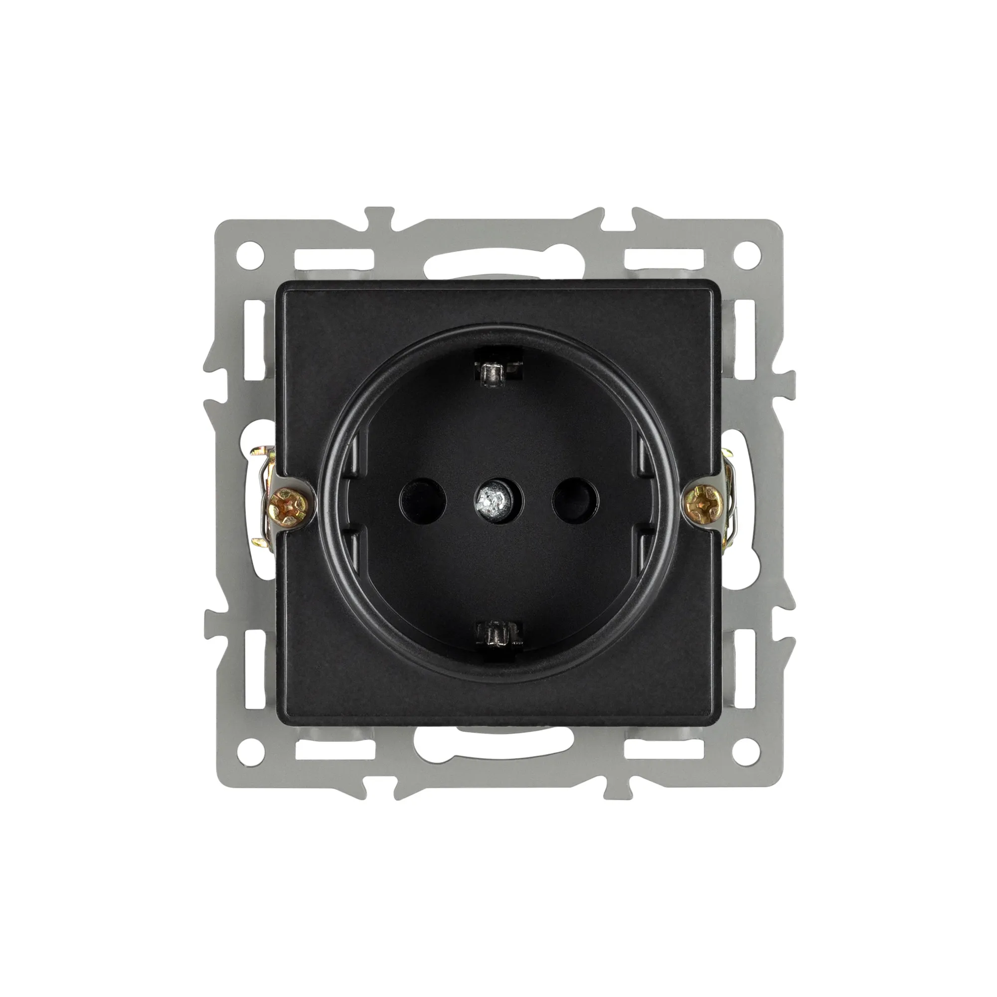 Механизм розетки с заземлением на 1 пост, с суппортом из алюминия. Цвет - черный. Степень пылевлагозащиты - IP20.