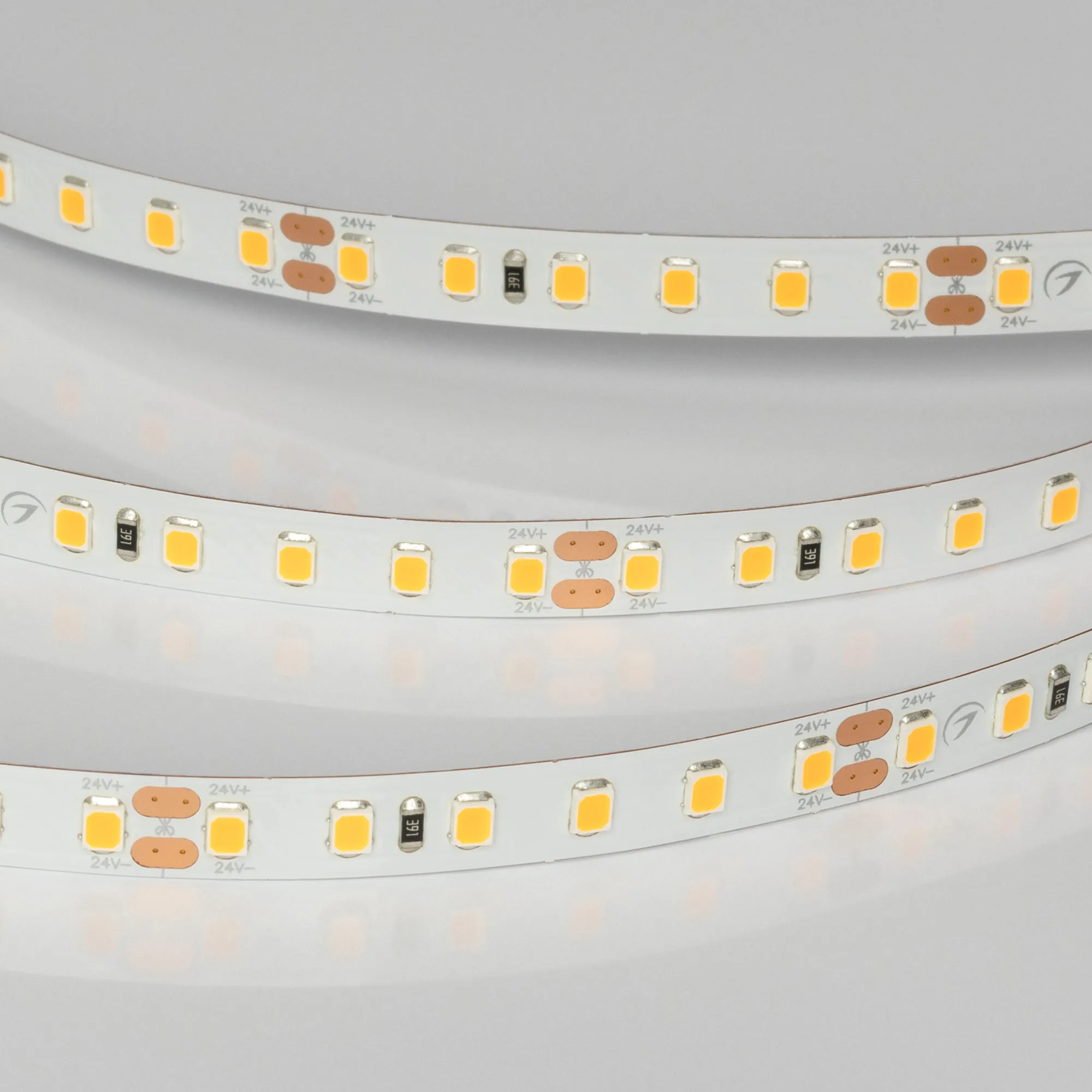 Светодиодная лента UL серии A120. Светодиоды SMD 2835, 120 шт/м, белая плата шириной 8 мм, скотч 3M. Цвет ТЕПЛЫЙ 1900K, индекс цветопередачи CRI>90, угол 120°. Питание 24 В, мощность 9.6 Вт/м (48 Вт на 5 м). Размеры 5000x8x1.5 мм. Мин. отрезок 50 мм, 6 светодиодов. Цена за 1 м. Рекомендуется установка на профиль.