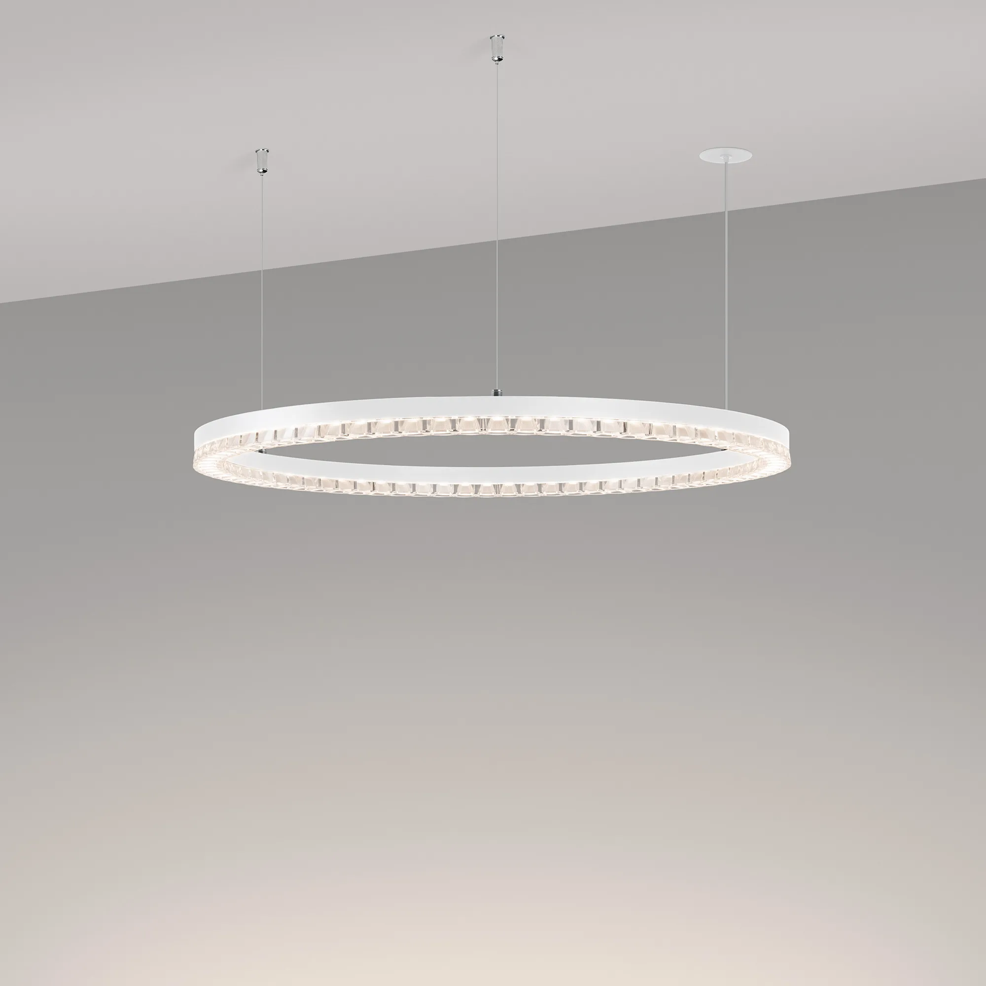 Под заказ. Подвесной светильник. Мощность 36 Вт, св. поток 3160 лм, 80-95 лм/Вт, дневной белый 4000K, CRI>90, угол 45°, напряжение питания 230 В. Белый круглый корпус из алюминия, экран PMMA, степень защиты IP20. Размер: диаметр 650 мм, высота 34 мм, ширина профиля 30 мм, размер чаши: диаметр 65 мм, высота 26 мм. Монтаж подвесной, длина подвеса 1200 мм, тип чаши встраиваемый, диаметр установочного отверстия чаши 60 мм. Драйвер 27-38 В, 1050 мА. Пульсация <0,3 %.