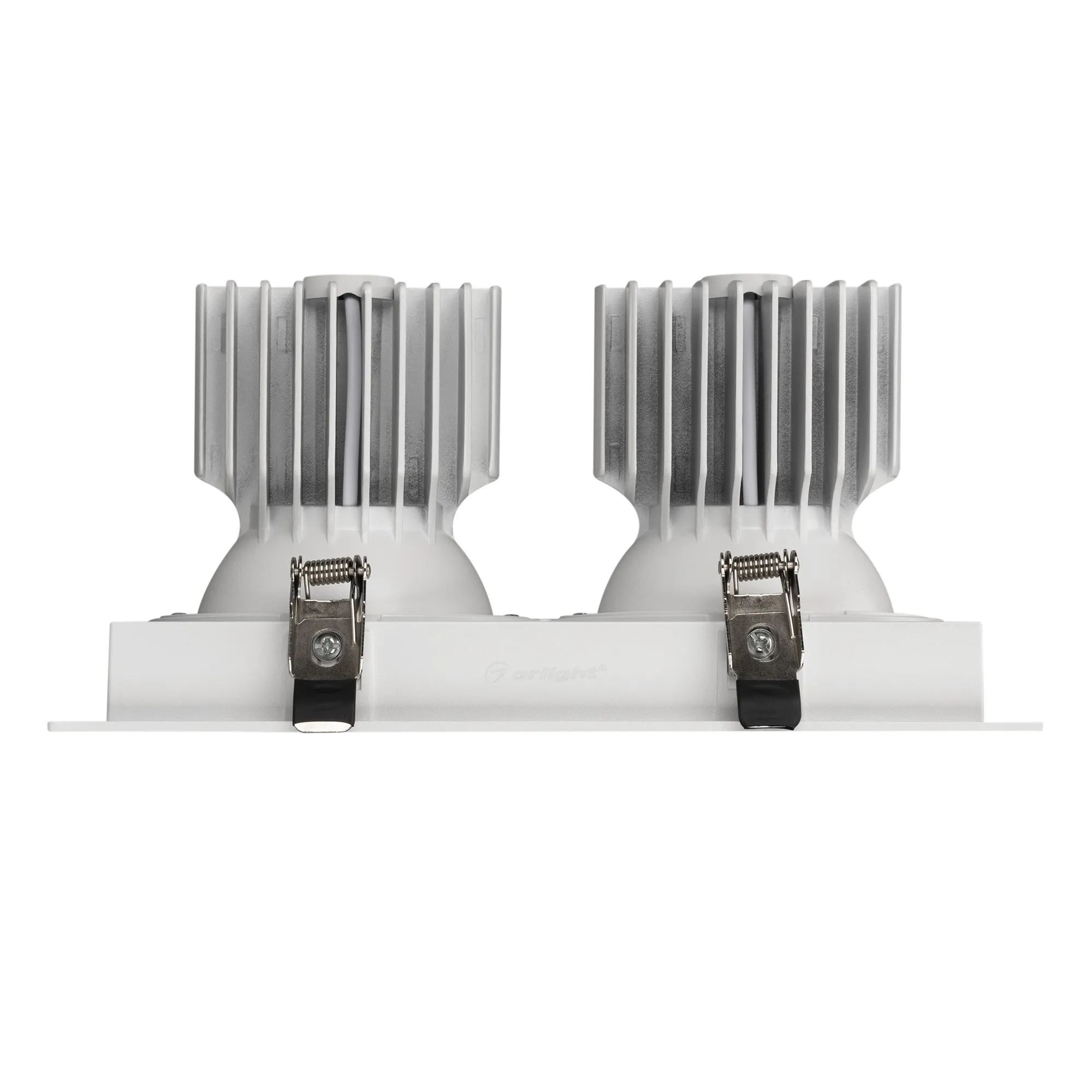 Встраиваемый карданный светильник. Мощность 2х30 Вт, св. поток 6520 лм, 109 лм/Вт, дневной 3000 K, CRI>92, угол 30°, напряжение питания 230 В. Белый корпус из алюминия, степень защиты IP20. Размер: длина 250 мм, ширина 140 мм, высота 125 мм. Монтаж встраиваемый, установочное отверстие: длина 230 мм, ширина 120 мм. Драйвер 24-42 В, 750 мА, пульсация <2%.