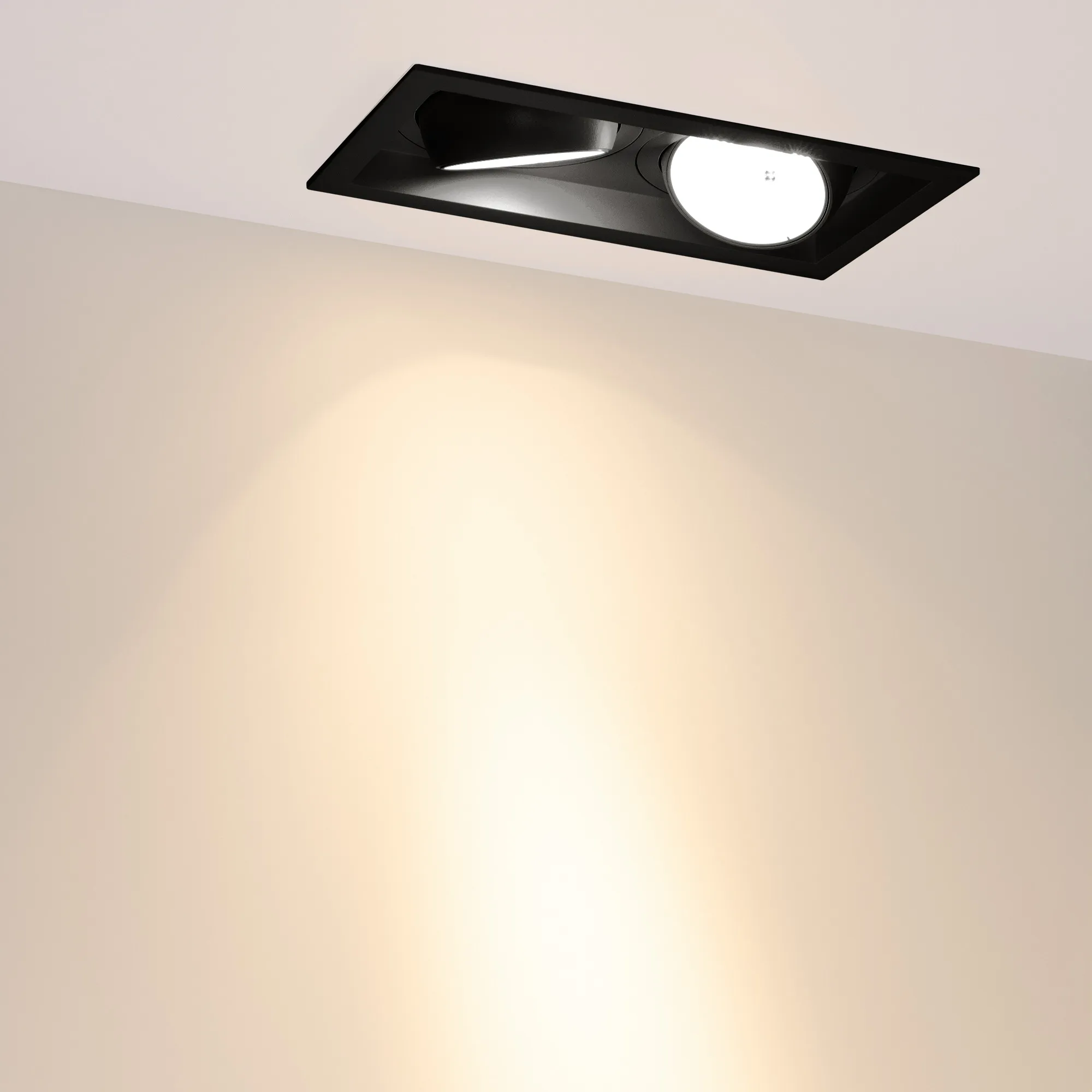 Поставка под заказ от 24 шт. Встраиваемый карданный светильник. Мощность 2х30 Вт, св. поток 6208 лм, 103 лм/Вт, тёплый 3000 K, CRI>92, угол 17°, напряжение питания 230 В. Чёрный корпус из алюминия, черная вставка, степень защиты IP20. Размер: длина 250 мм, ширина 140 мм, высота 125 мм. Монтаж встраиваемый, установочное отверстие: длина 230 мм, ширина 120 мм. Драйвер 24-42 В, 750 мА, пульсация <2%.