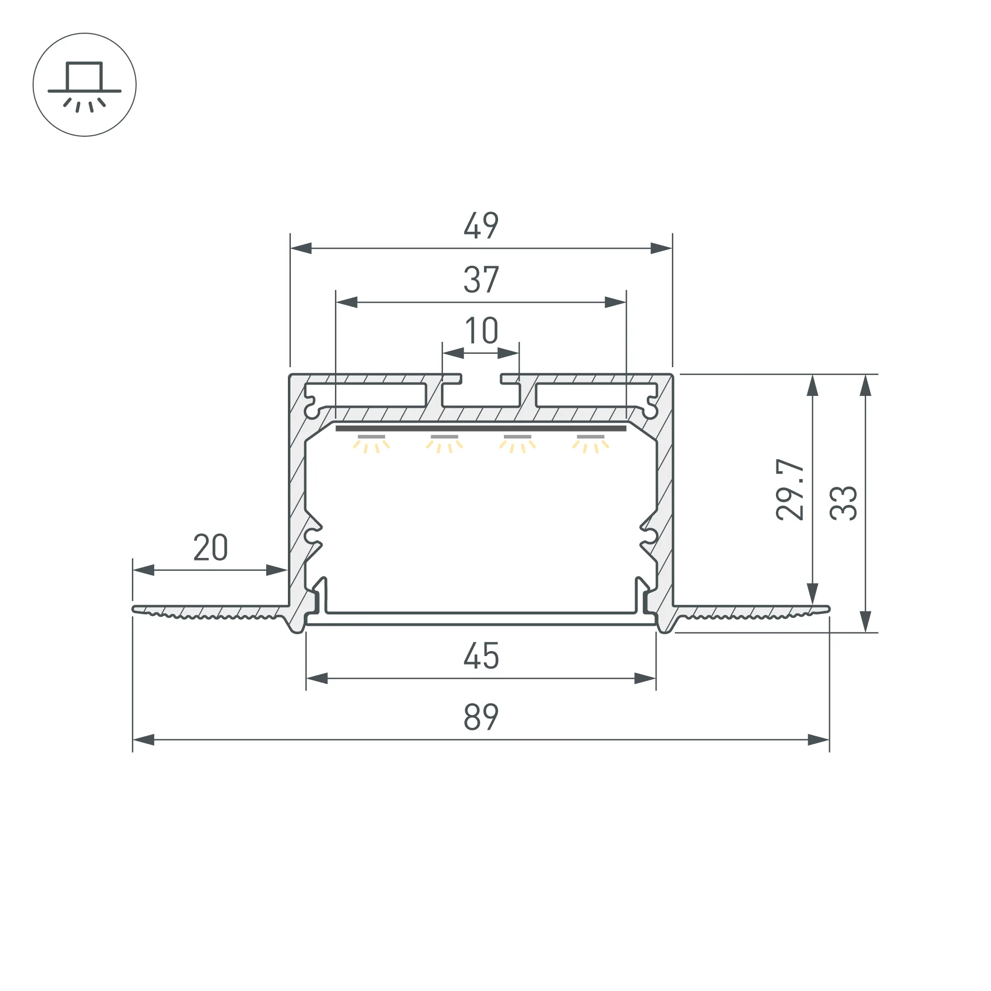 Алюминиевый анодированный профиль для светодиодных лент и линеек. Габаритные размеры (L×W×H): 2000x89x33 мм, паз для установки 49 мм. Ширина площадки для ленты 37 мм. Экраны, заглушки и другие аксессуары приобретаются отдельно. Цена за 1 метр.