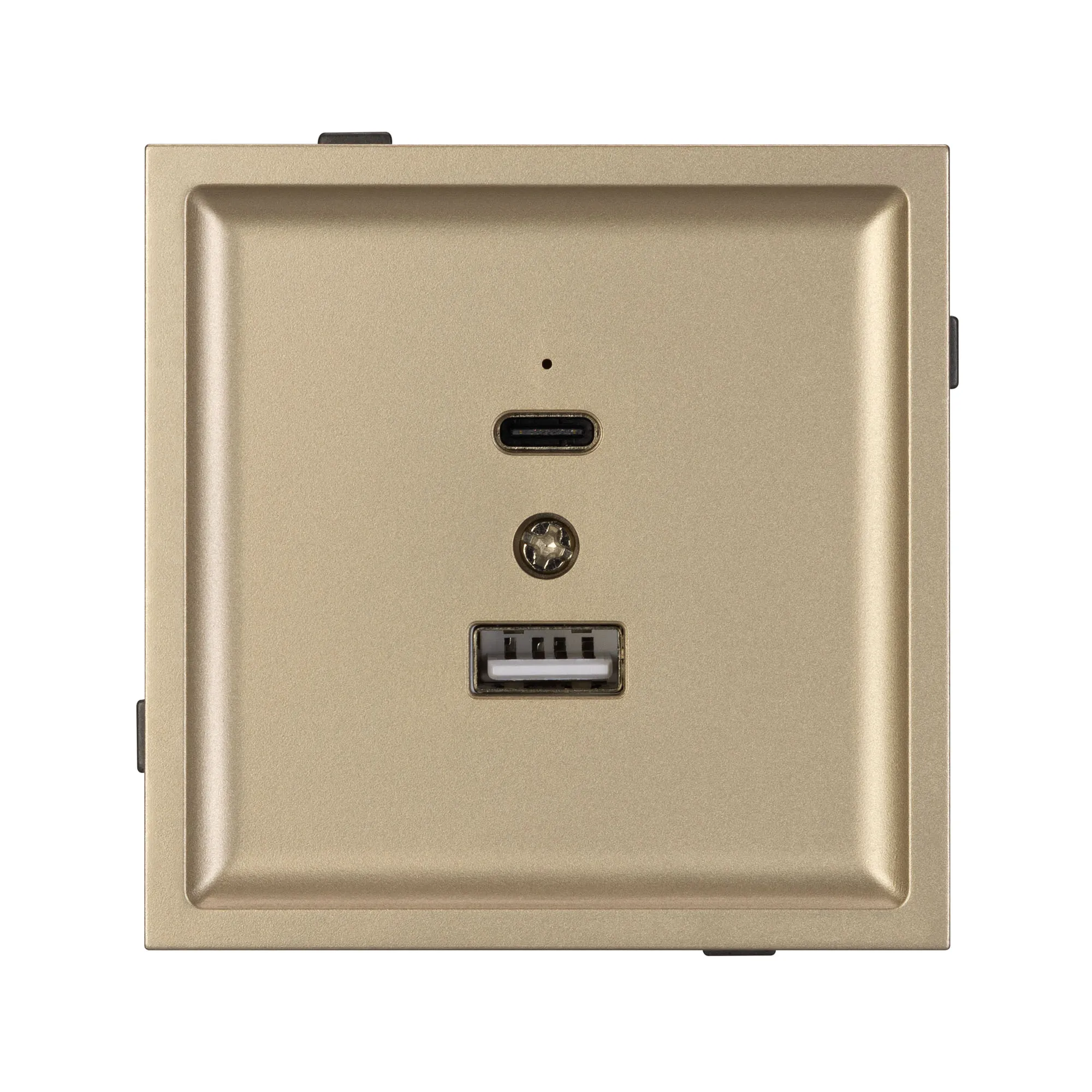 Механизм USB розетки на 2 порта Type A + Type C. Цвет - матовый песочный, с Soft-Touch покрытием. Без фронтальной рамки. Выходная мощность для USB Type C порта не превышает 20W. Уровень пылевлагозащиты IP20. Устанавливается в стандартный подрозетник круглого сечения диаметром 60мм.
